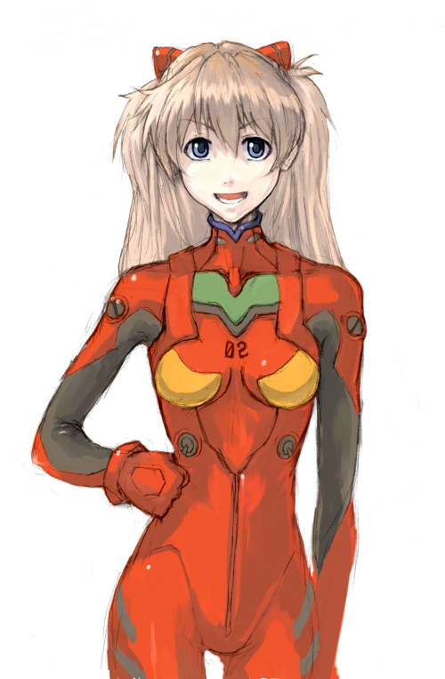 :d1girlalternate hair colorarm at sideblue eyesbodysuitbracerbreastsbrown hairclenched handcowboy shotfacing viewerfemale focusgloveshair between eyeshand on own hiphappyheadgearlong hairlooking at viewermecha pilot suitopen mouthplugsuit (evangelion)simple backgroundsketchskinnysmall breastssmilesolostandingturtlenecktwintailstwo side upv-shaped eyebrowswhite background