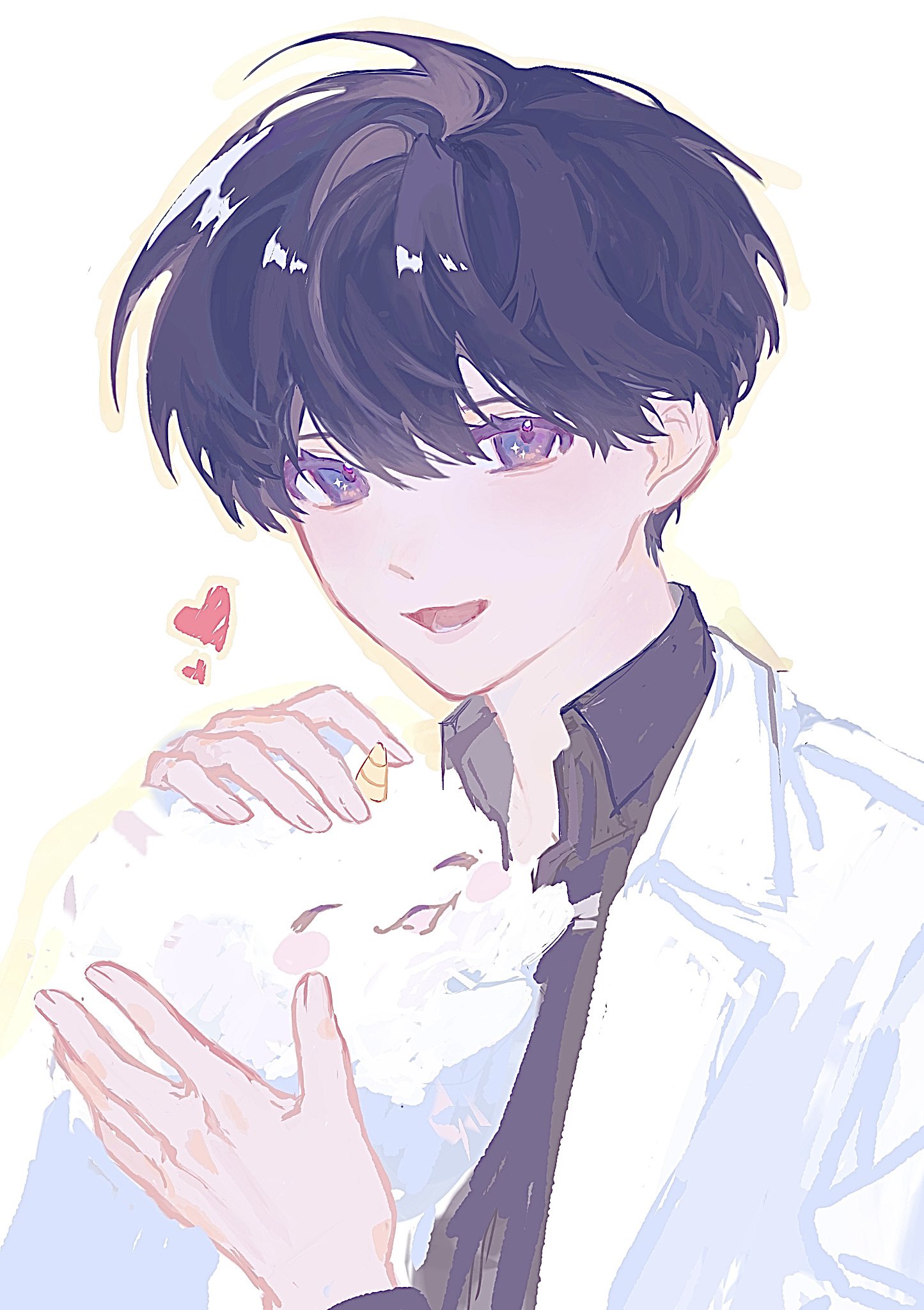 1boyanimalanimal hugblack hairblack shirtcoatcollared shirtheartlooking at viewermale focusshirtshort hairsparkling eyesupper bodyv kyyiwhite coat