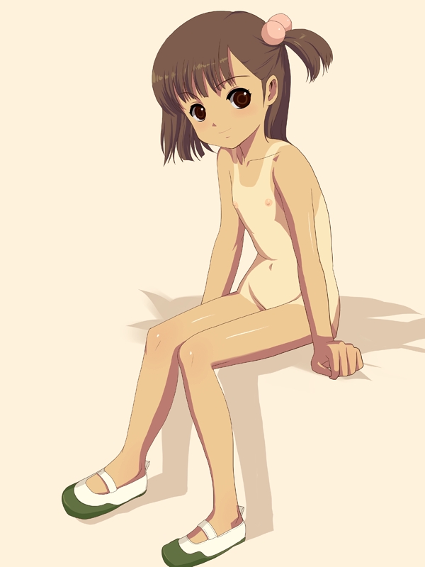 1girlbrown eyesbrown hairfemale focusflat chestlolinavelnipplesnudeone-piece tanpaint.net (medium)shoesshort hairside ponytailsittingsolotantanline
