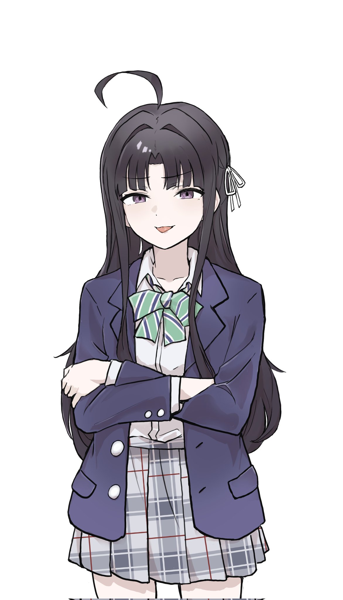 1girlahogeblack hairblue jacketcollared shirtcrossed armsdress shirtgrey skirthair ribbonjacketlong hairopen clothesopen jacketopen mouthparted bangsplaid clothesplaid skirtpleated skirtpurple eyesribbonshirtshirt tucked insimple backgroundskirtsolotonguetongue outwhite backgroundwhite ribbonwhite shirt
