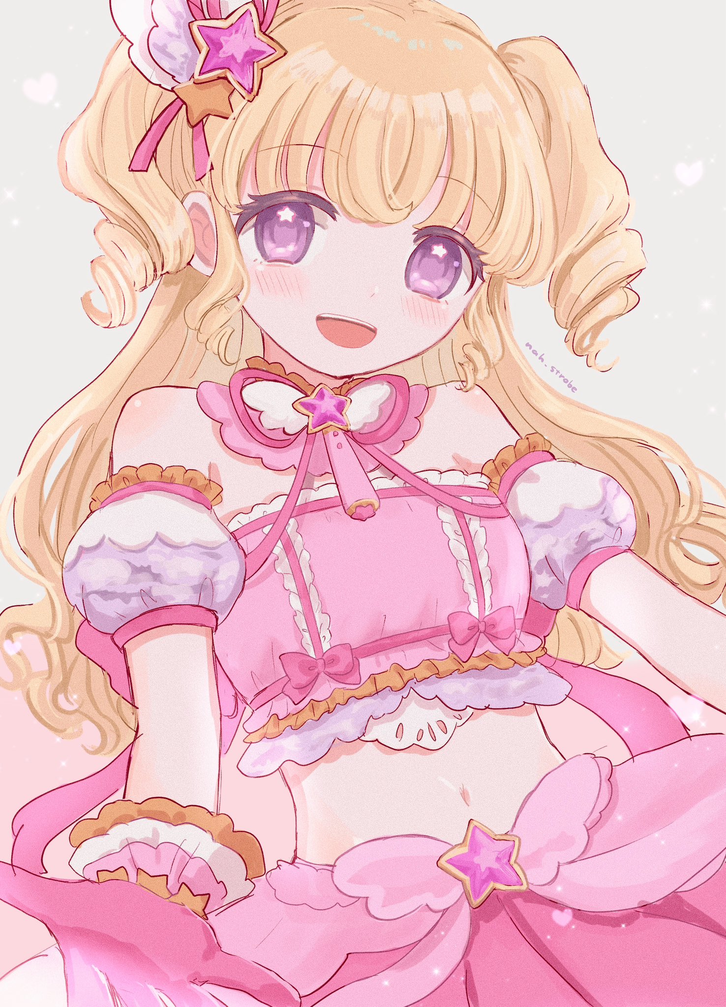 :d1girlblonde haircrop topdetached sleevesgloveslong hairlooking at viewernavelneck ribbonopen mouthpink glovespink ribbonpink shirtpink skirtpuffy detached sleevespuffy short sleevespuffy sleevespurple eyesribbonringletsshirtshort sleevesskirtsmilesolostar (symbol)two side upyukimi (nah strobe)