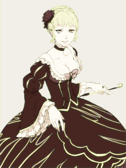 00s1girlblonde hairblue eyesbreastschokercleavagedressfemale focusfrillskiserulong hairsmilesmoking pipesolo