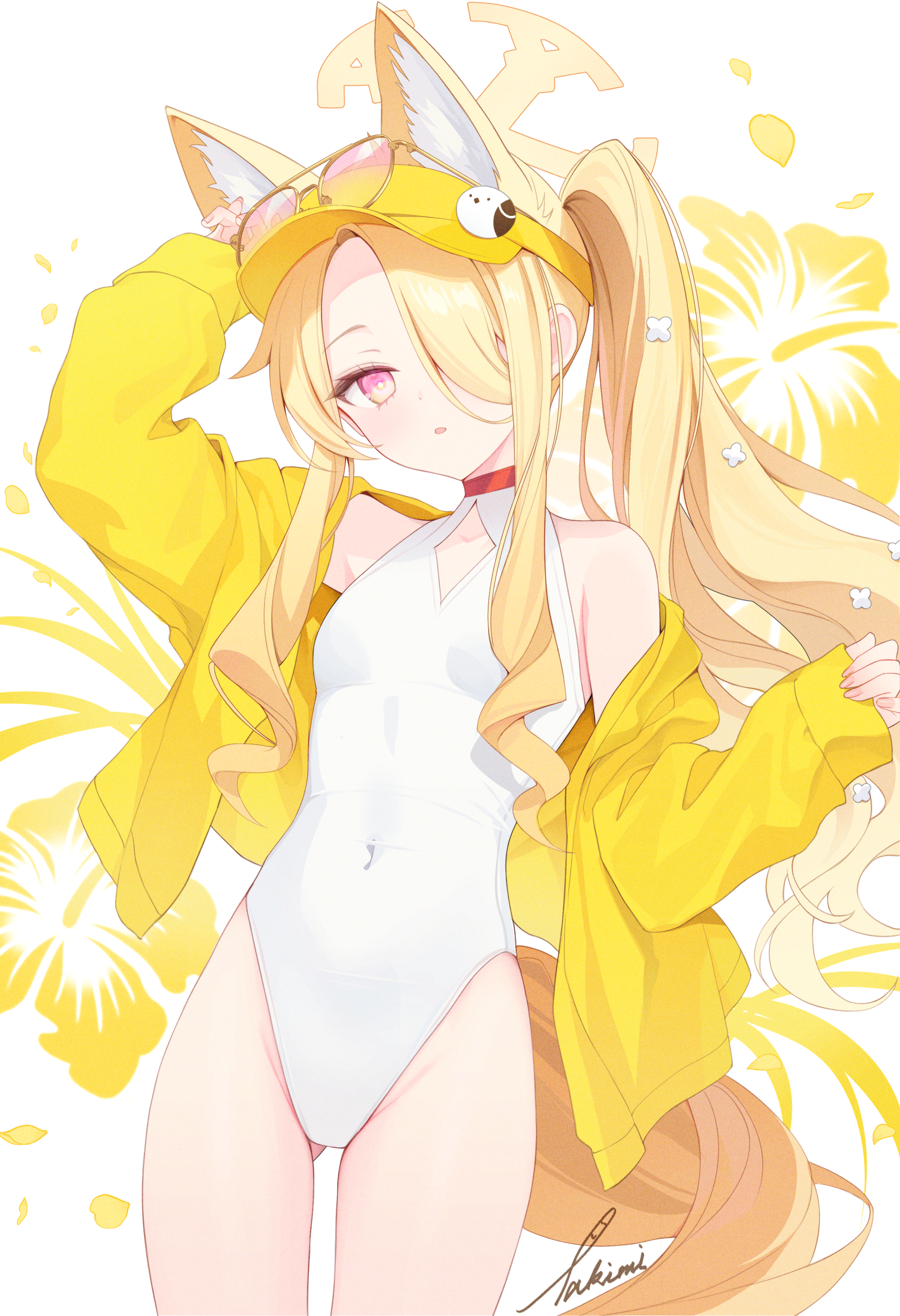 1girlabove-cleavage cutoutanimal ear fluffanimal earsarm upblonde hairbreastsclothing cutoutcovered navelcowboy shotcross halodiamond cutoutfloral backgroundfox earsfox girlgluteal foldhair over one eyehalohighleghighleg one-piece swimsuitjacketlong hairlong sleeveslooking at vieweroff shoulderofficial alternate costumeofficial alternate hairstyleone eye coveredone-piece swimsuitopen clothesopen jacketparted lipspink eyesside ponytailsignaturesleeves past wristssmall breastssolostandingsunglassesswimsuitvery long hairvisor capwhite one-piece swimsuityellow haloyellow jacket