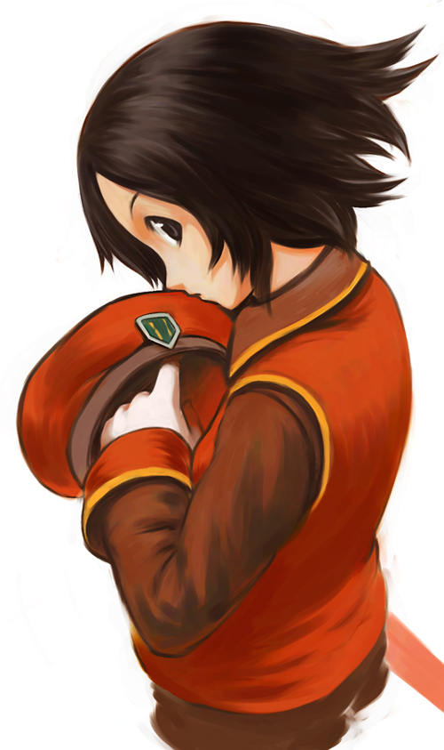 1girlbackberetblack eyesblack hairfemale focushatholdingholding unworn clothesholding unworn hatlooking backshort hairsimple backgroundsolounworn hatunworn headwearwhite background
