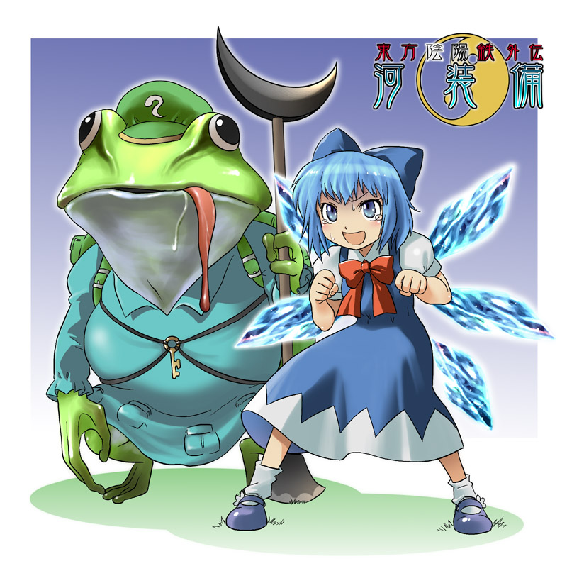 2girlsbackpackbagblue eyesblue hairdressfemale focusfroggradient backgroundhatkeymultiple girlsrandoserushort hairtearstonguewings