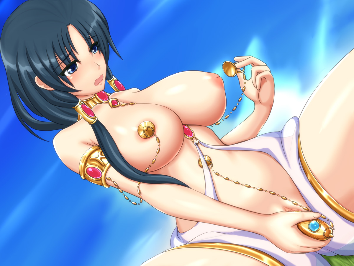 yamanezumi rokikku, original, 1girl, black hair, blush, breasts, brown eyes, female focus, fundoshi, japanese clothes, long hair, looking at viewer, medium breasts, nipples, one-piece tan, simple background, solo, standing, tan, tanline, topless female, towel, wading, water, white background