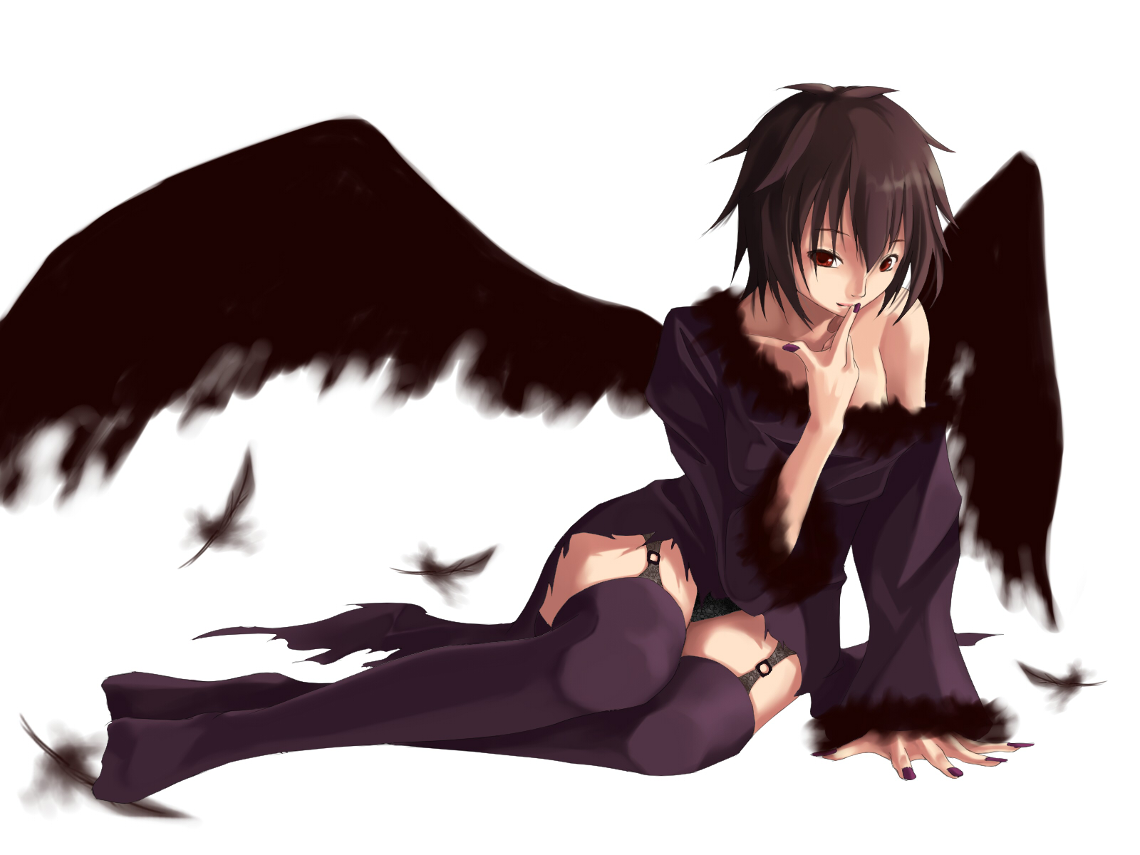 1girlbrown hairdressfallen angelfeathersfemale focusgarter beltnail polishpantiespurple nailsred eyesshort hairsimple backgroundsolothighhighsunderwearupskirtwings
