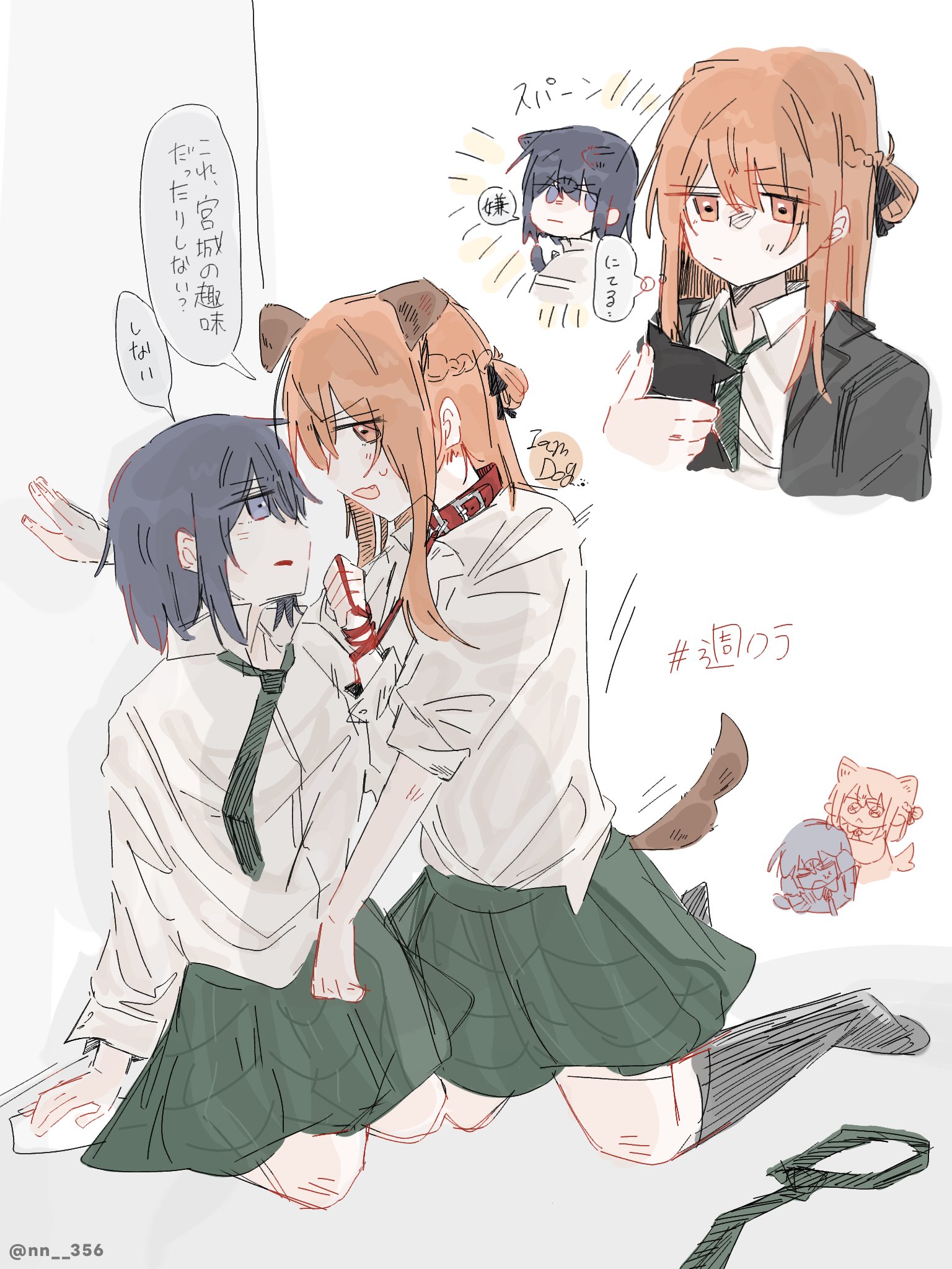 2girlsanimal earsblack catblack hairblack jacketblazerblue eyesbraidbrown eyesbrown haircatcat earscat girlcat taildog earsdog girldog tailfanggreen necktiegreen skirthalf up braidjacketkemonomimi modelong hairmultiple girlsnecktienn 356open mouthparted lipspleated skirtschool uniformshort hairskirtspeech bubblesweattailyuri