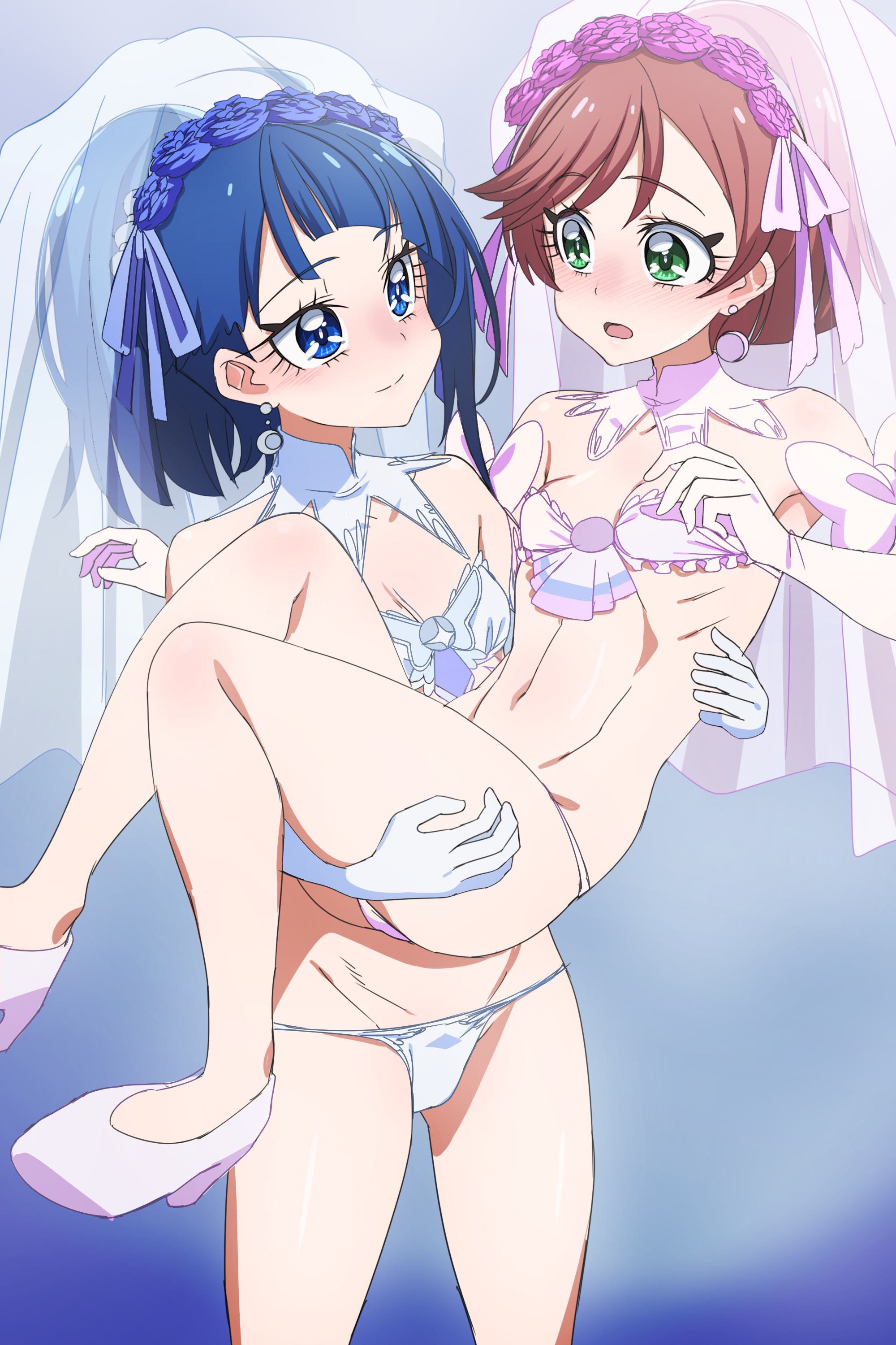 2girlsbikiniblue backgroundblue eyesblue hairblushbreastsbridal bikinibridal veilcarryingclosed mouthearringselbow gloveseye contactglovesgreen eyeshigh heelsjewelrylong hairlooking at anothermultiple girlsopen mouthorange hairpink shoesprincess carryribsshoessmall breastssmilestomachswimsuitveilwhite bikiniwhite gloveswife and wifeyuri