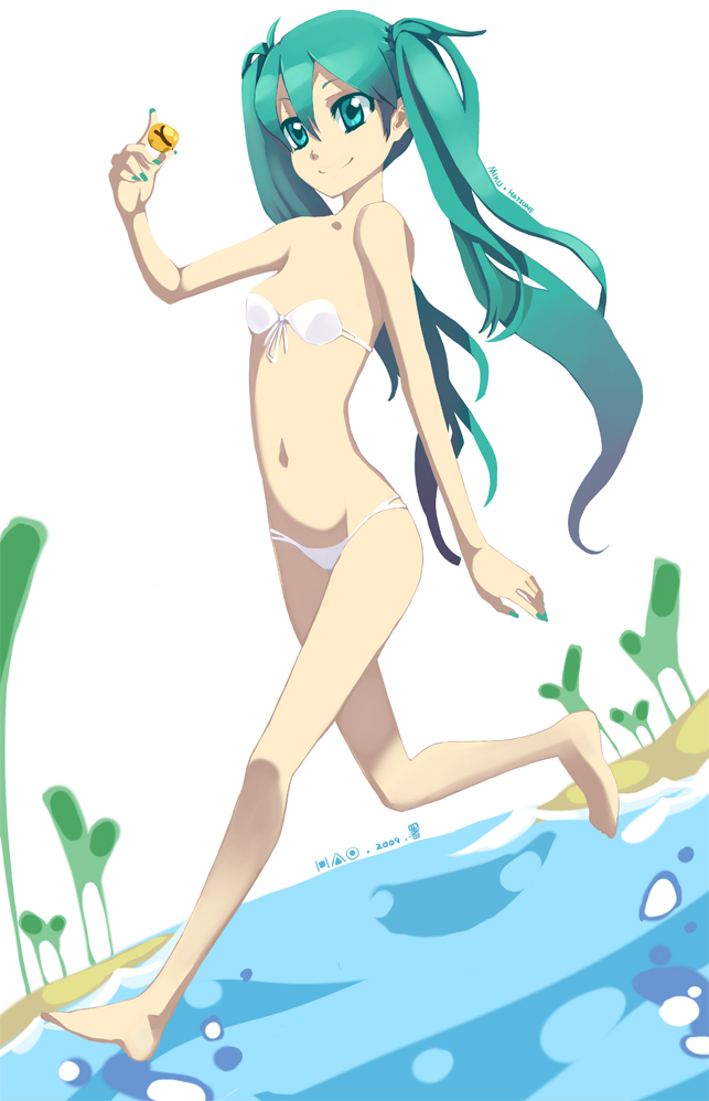 1girlbarefootbikinifemale focusflat chestgreen eyesgreen hairgreen nailslong hairmatching hair/eyesnail polishsolospring onionswimsuittwintailswalking