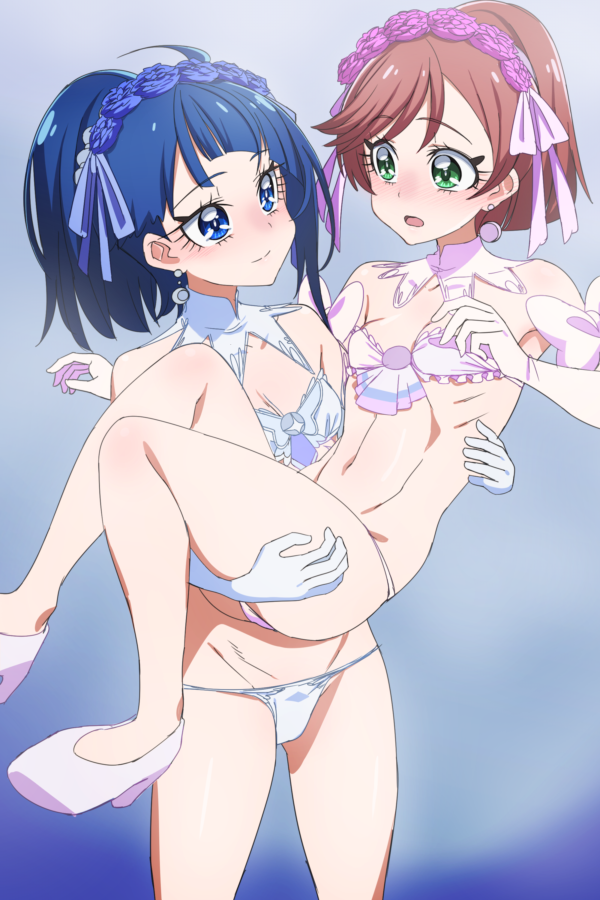 2girlsbikiniblue backgroundblue eyesblue hairblushbreastscarryingclosed mouthearringselbow gloveseye contactglovesgreen eyeshigh heelsjewelrylong hairlooking at anothermultiple girlsopen mouthorange hairpink shoesprincess carryribsshoessmall breastssmilestomachswimsuitwhite bikiniwhite glovesyuri