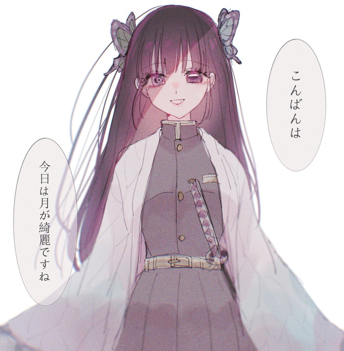 1girlbeltblack hairbutterfly hair ornamentcowboy shotcrazy eyesdemon slayer uniformgrinhair ornamenthaorijapanese clotheskatanalong hairpurple eyessimple backgroundsmilespeech bubbleswordteethweaponwhite backgroundxiao yin
