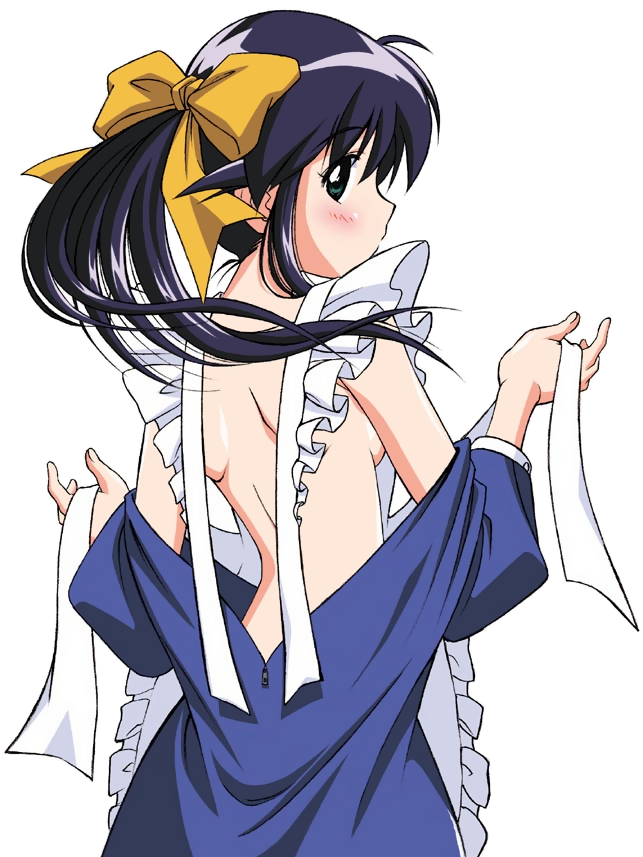 1girlapronblushbowbreastsfemale focusfrillshair bowlooking backmaidmaid apronponytailribbonsideboobsimple backgroundsmall breastssoloundressing