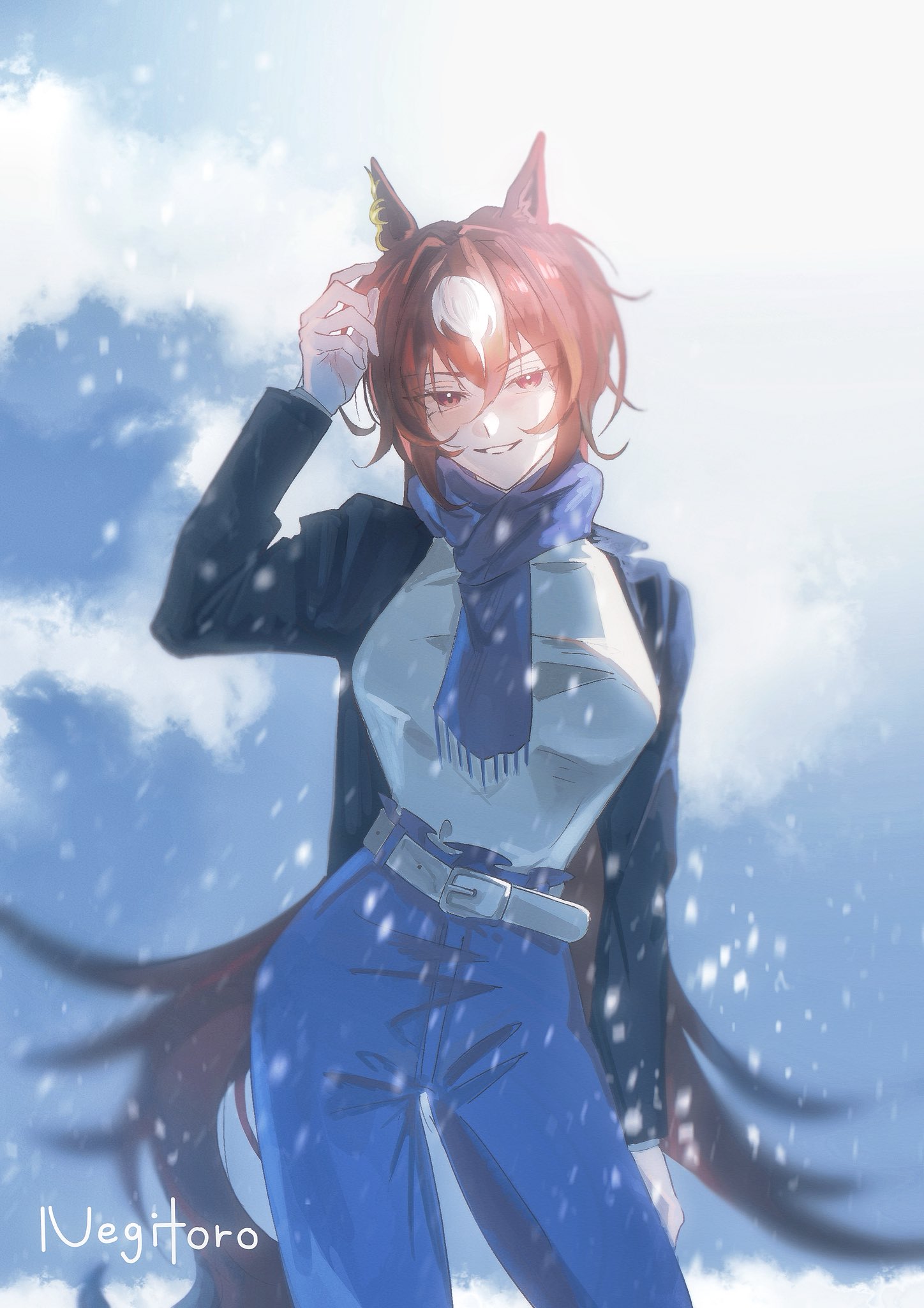 1girlanimal earsbeltblack jacketblue pantsblue scarfblushbreastsbrown hairear ornamenthair between eyeshorse earshorse girlhorse tailjacketlong hairlong sleeveslooking at viewermedium breastsmulticolored hairnegitoro 0326open clothesopen jacketpantsparted lipsred eyesscarfshirtsmilesnowingsolostreaked hairtailvery long hairwhite beltwhite hairwhite shirt