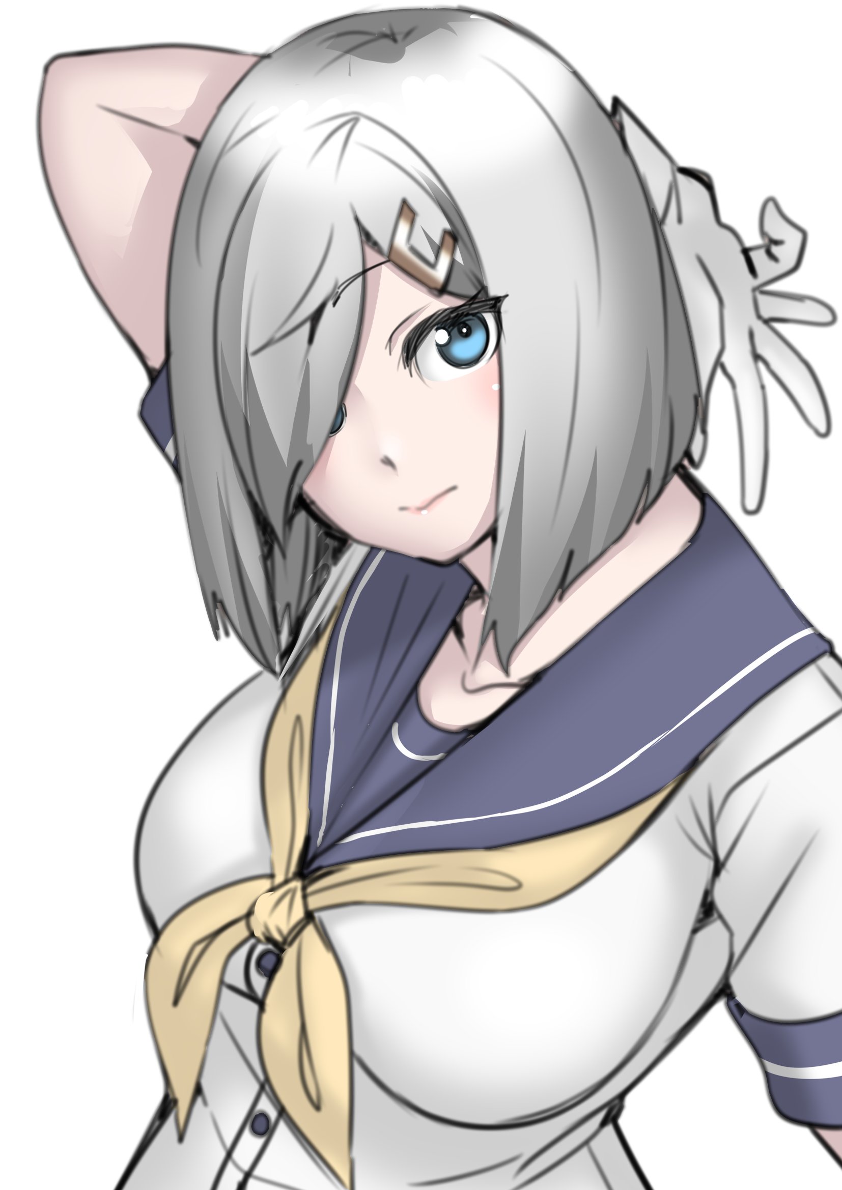 1girlblue eyesblue sailor collarglovesgrey hairhair ornamenthair over one eyehaircliplooking at viewerneckerchiefsailor collarsailor shirtschool uniformserafukushirtshort hairsimple backgroundsoloupper bodywhite backgroundwhite glovesyellow neckerchief
