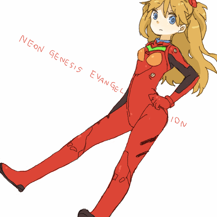 1girlarm at sideblue eyesbodysuitbreastsbrown hairclosed mouthcolored eyelashescontrappostocopyright namedutch anglefemale focusfrom sidefrownfull bodygloveshand on own hipheadgearlegs apartlong hairlooking at viewermecha pilot suitoekakiparted bangsplugsuit (evangelion)short eyebrowssimple backgroundsketchsmall breastssolostandingturtlenecktwo side upwhite background