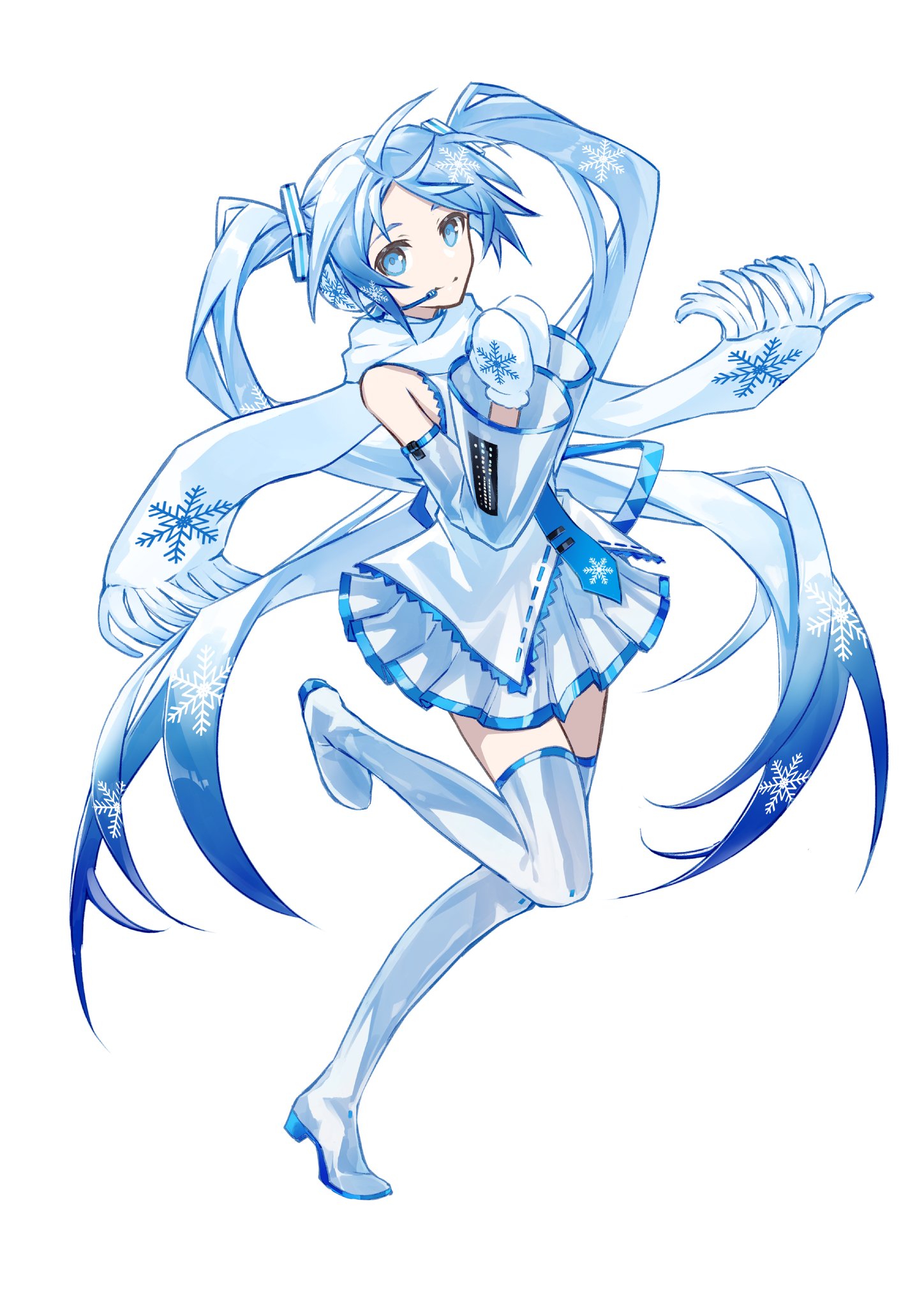 1girlbare shouldersblue eyesblue hairblue necktiebootsclosed mouthdetached sleevesfull bodygrey bootsgrey shirtgrey skirtgrey sleevesheadsetlong hairlong sleeveslooking at viewerminiskirtmittensnecktiepleated skirtscarfshirtsimple backgroundskirtsleevelesssleeveless shirtsmilesolosplit mouthstandingstanding on one legthigh bootsthighhighstie cliptwintailsvery long hairwhite backgroundwhite mittenswhite scarfzettai ryouiki