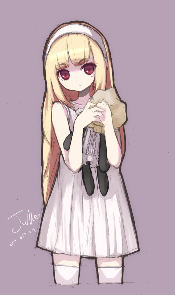 1girlblonde hairchildcowboy shotcropped legsdressfemale focushairbandlong hairmolemole under eyered eyessimple backgroundsolostuffed animalstuffed toythighhighswhite thighhighs