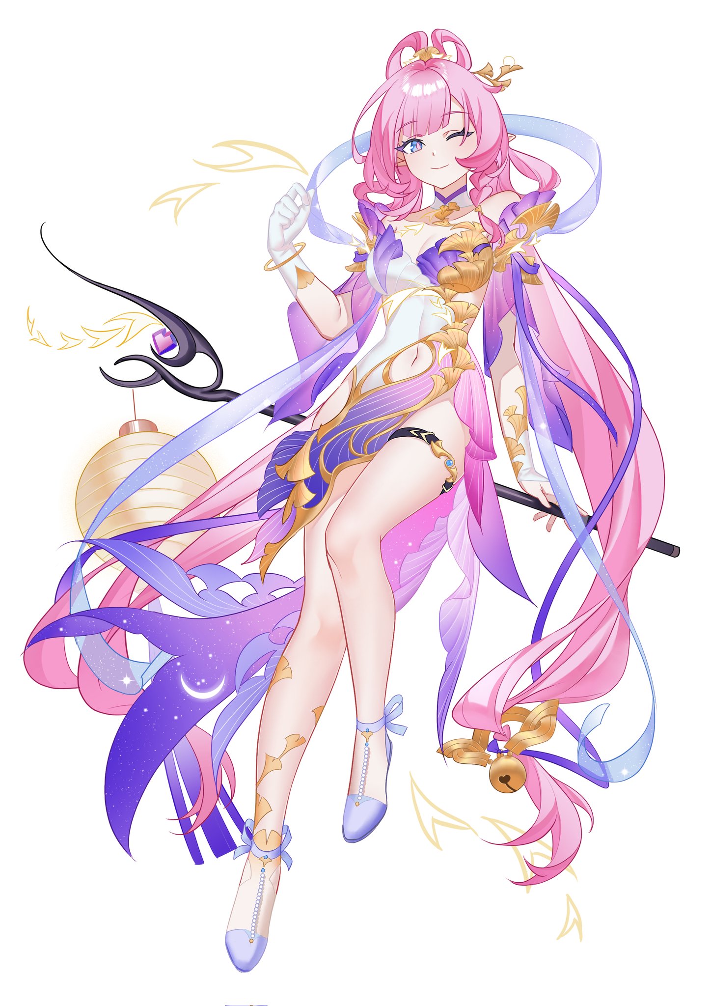 1girlalternate costumeblue eyesbreastsdressfull bodygloveshigh heelsholdingholding stafflarge breastslong hairpink hairsimple backgroundsolostaffthigh strapthighsvery long hairwhite backgroundwhite dresswhite gloves