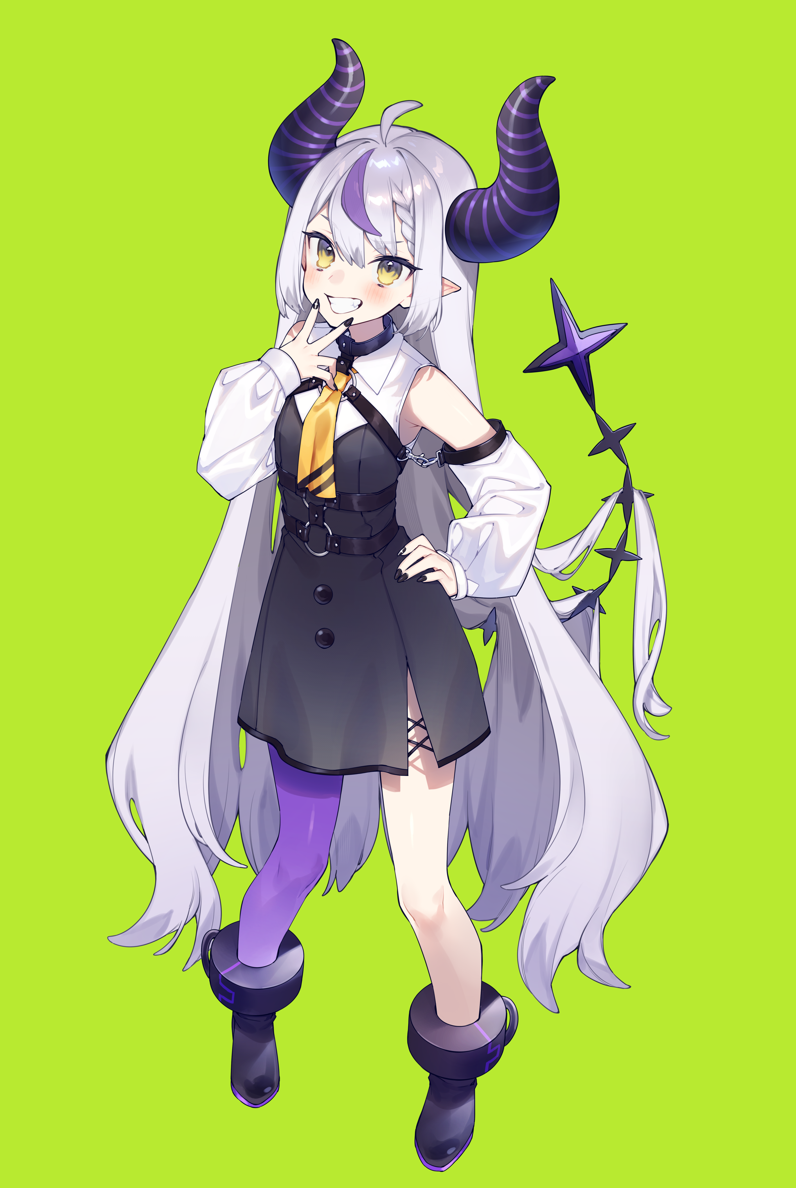1girlahogebare shouldersblack bootsblack dressblushbootscollared shirtdetached sleevesdressfull bodygreen backgroundgrey hairgrinhair between eyeshand on own hiphand uphornslong hairlong sleeveslooking at viewermulticolored hairpantyhosepinafore dresspointy earspurple hairpurple pantyhoseshirtsidelockssimple backgroundsingle leg pantyhosesleevelesssleeveless dresssleeveless shirtsmilesolostandingstreaked hairstriped hornsvery long hairvirtual youtuberwhite shirtwhite sleevesyellow eyes