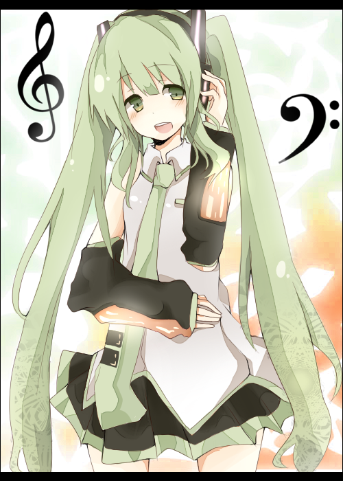 1girldetached sleevesfemale focusgreen eyesgreen hairheadphoneslong hairmatching hair/eyesnecktieskirtsmilesolosquare-end necktietwintails