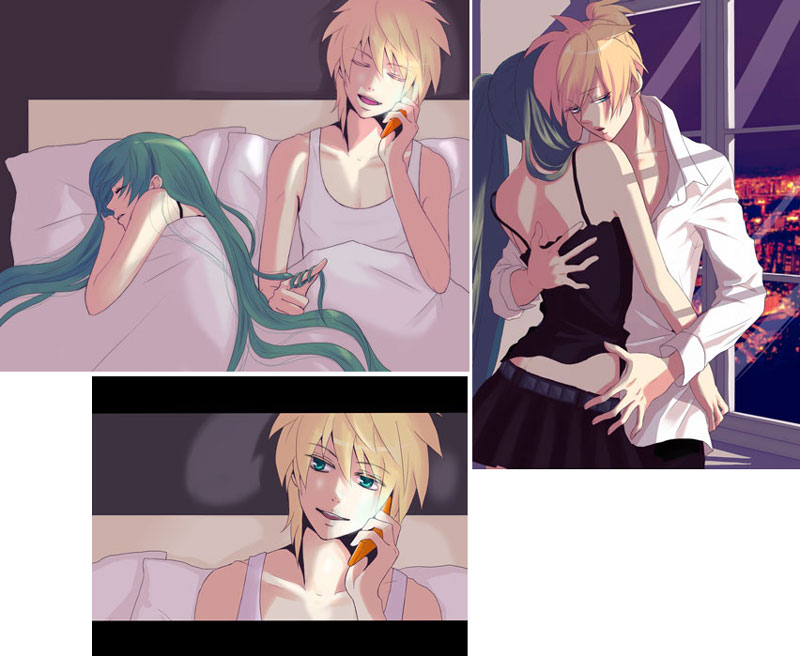 1boy1girlaqua hairblonde hairblue eyescellphonecuplong hairphoneshort hairskirtsleepingsmilespice!twintailsvery long hairyunomi