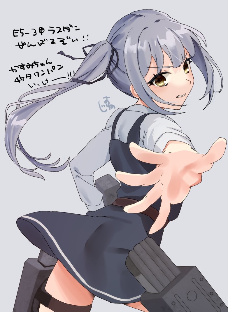 1girladapted turretassbackblack ribbonblushbrown eyescowboy shotdressgrey backgroundgrey hairhair ribbonlong hairlong sleeveslooking at viewerneck ribbonpinafore dressred ribbonribbonschool uniformshirtside ponytailsleevelesssleeveless dresssolotorpedo launchertorpedo tubeswhite shirt