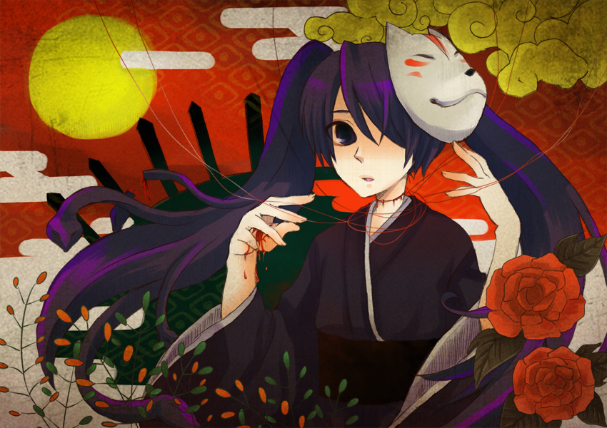 1girlblack eyesbloodcloudegasumifemale focusflowerfox maskfull moonjapanese clotheskimonolong hairmaskmoonnightpurple hairsolotwintailsyukata
