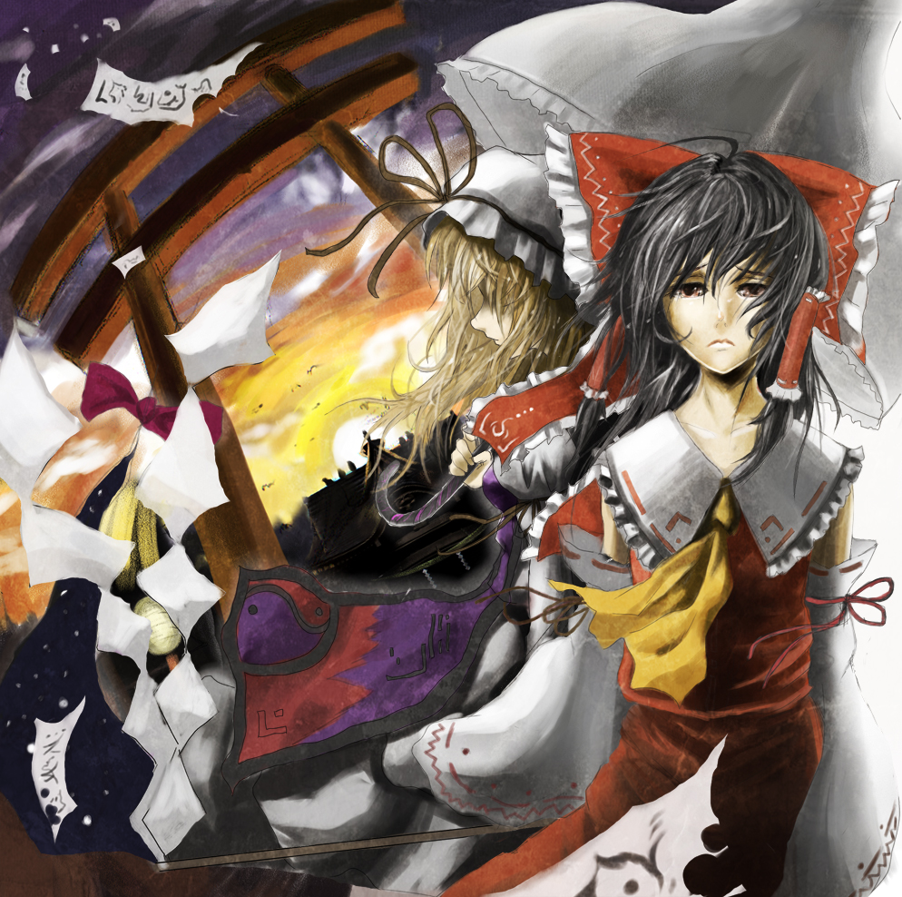 2girlsblonde hairbrown hairdetached sleevesfemale focushatjapanese clothesmikomultiple girlstoriiumbrella