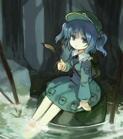 1girlbackpackbagbarefootblue eyesblue haircattailfemale focusforesthair bobbleshair ornamenthatkeymatching hair/eyesnatureplantrandoserushort hairsittingsoaking feetsolotailtwintailstwo side upwater
