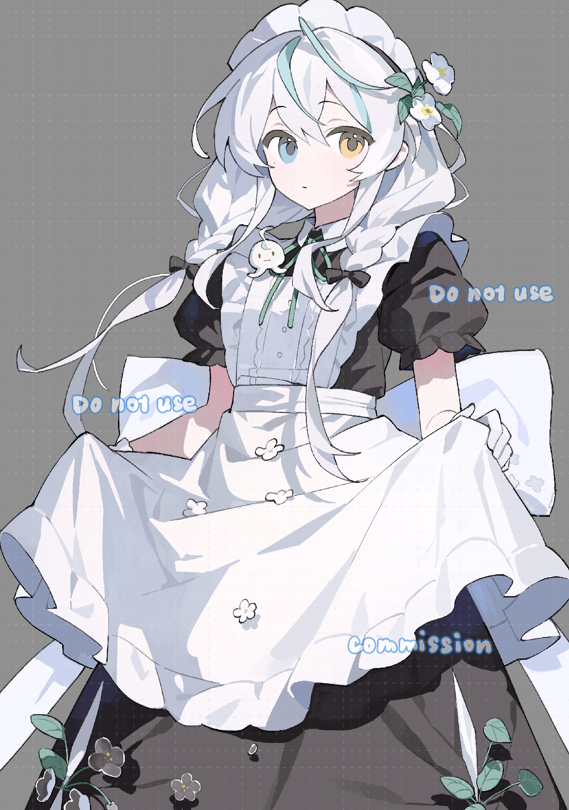 1girlapronback bowblack bowblack dressblue eyesbowbraidclosed mouthcollared dressdressflowerfrilled apronfrillsglovesgrey backgroundhair between eyeshair bowhair flowerhair ornamentheterochromialong hairlooking at viewermaidmaid apronmaid headdressmulticolored hairneck ribbonpuffy short sleevespuffy sleevesribbonsample watermarkshort sleevessimple backgroundskirt holdsolostreaked hairtwin braidswatermarkwhite apronwhite bowwhite flowerwhite gloveswhite hairyellow eyes