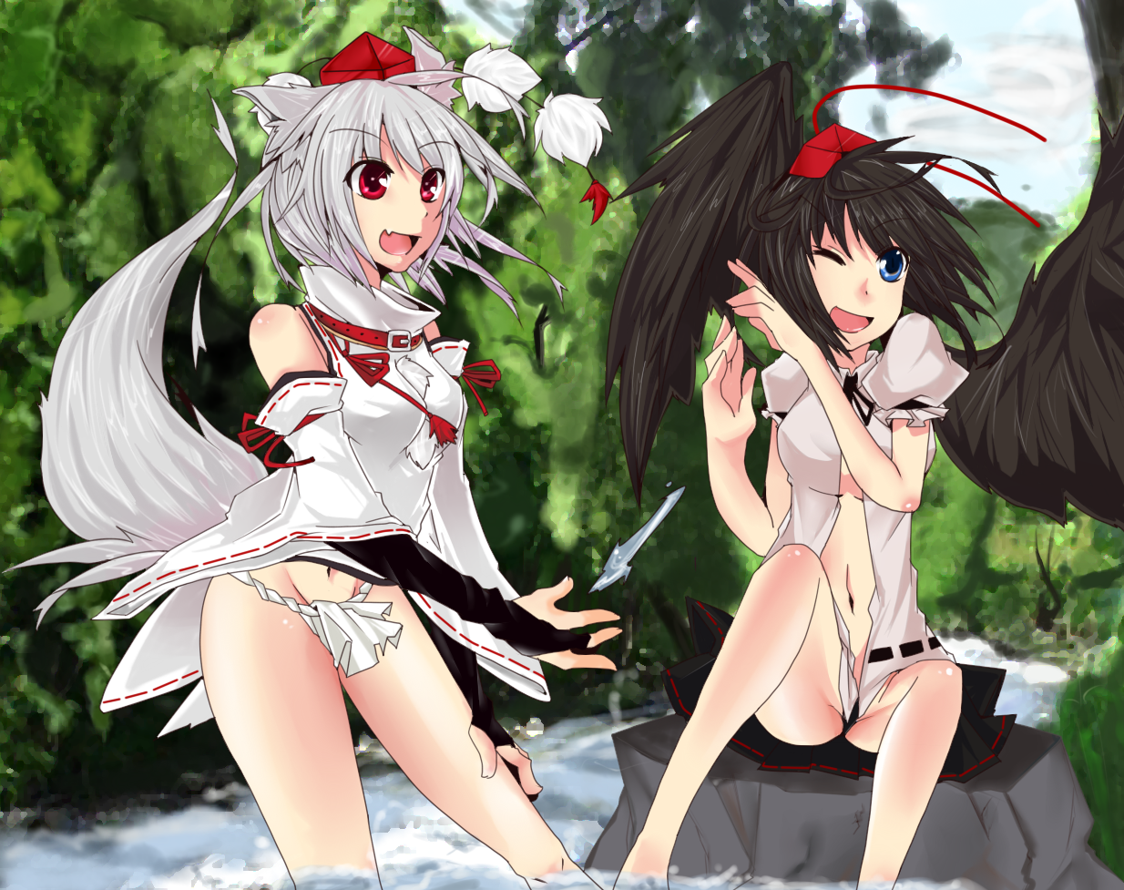 2girlsanimal earsbare shouldersblack hairblack wingsblue eyesbottomlessdetached sleevesfemale focusforestfundoshihatjapanese clothesmultiple girlsnatureno pantsopen clothesopen shirtred eyesriverrockshirtshort hairsittingsoaking feettailtokin hatwaterwingswolf earswolf tail