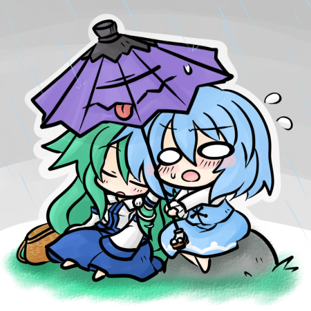 2girlsbasketblue hairblushchibiclosed eyesfemale focusgreen hairgrey backgroundholdingholding umbrellakarakasa obakelong hairmultiple girlsoutdoorsplantrainshort hairsittingsleepingtongueumbrella