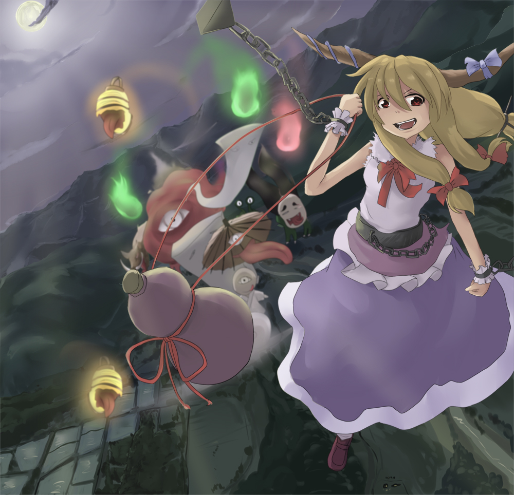 1girlblonde hairchainfemale focusflyinggourdhornskarakasa obakelong hairmonstermoonoil-paper umbrellared eyessolotongueumbrellawrist cuffs