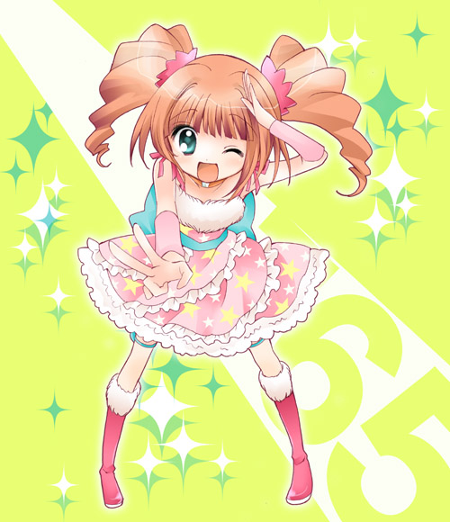 00s1girlbootsbrown haircute & girly (idolmaster)dressdrill hairfemale focusfrillslingerieone eye closedpetticoatprimary-star plum (idolmaster)salutesmilesolosparklestar (symbol)twin drillstwintailsunderwearvwinkwristband