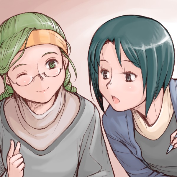 00s2girlsaged upbespectacledcasualglassesgreen eyesgreen hairhairbandmultiple girlsone eye closedshort hairwink
