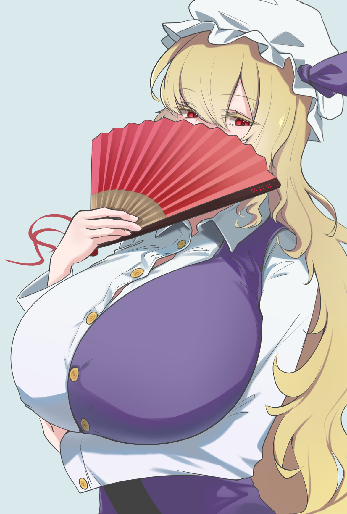 1girlarm under breastsblonde hairbreastscollared shirtdressfan to mouthhair between eyeshand fanhatholdingholding fanhuge breastslong hairlong sleeveslooking at viewermob cappurple dressred eyesshirtsoloupper bodyvery long hairwavy hairwhite shirt