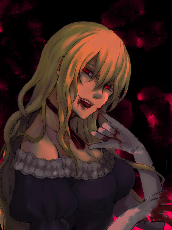 1girlblonde hairbloodbreastschokercleavageelbow glovesfemale focusfinger to mouthglovesgradient backgroundlong hairmedium breastsred eyessoloupper body