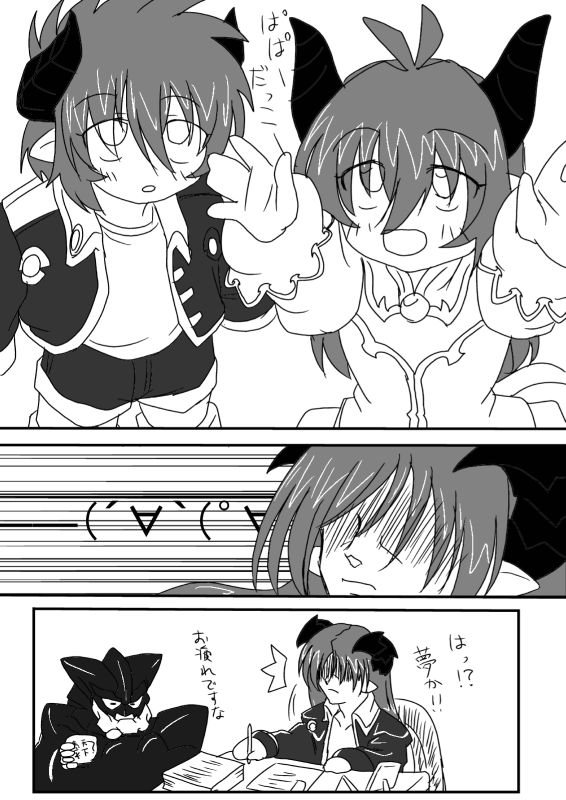 1girl3boysage differenceaged downchildcrowndemondemon girlfather and daughterfather and songreyscalehornsmonochromemultiple boyssurprisedsweat