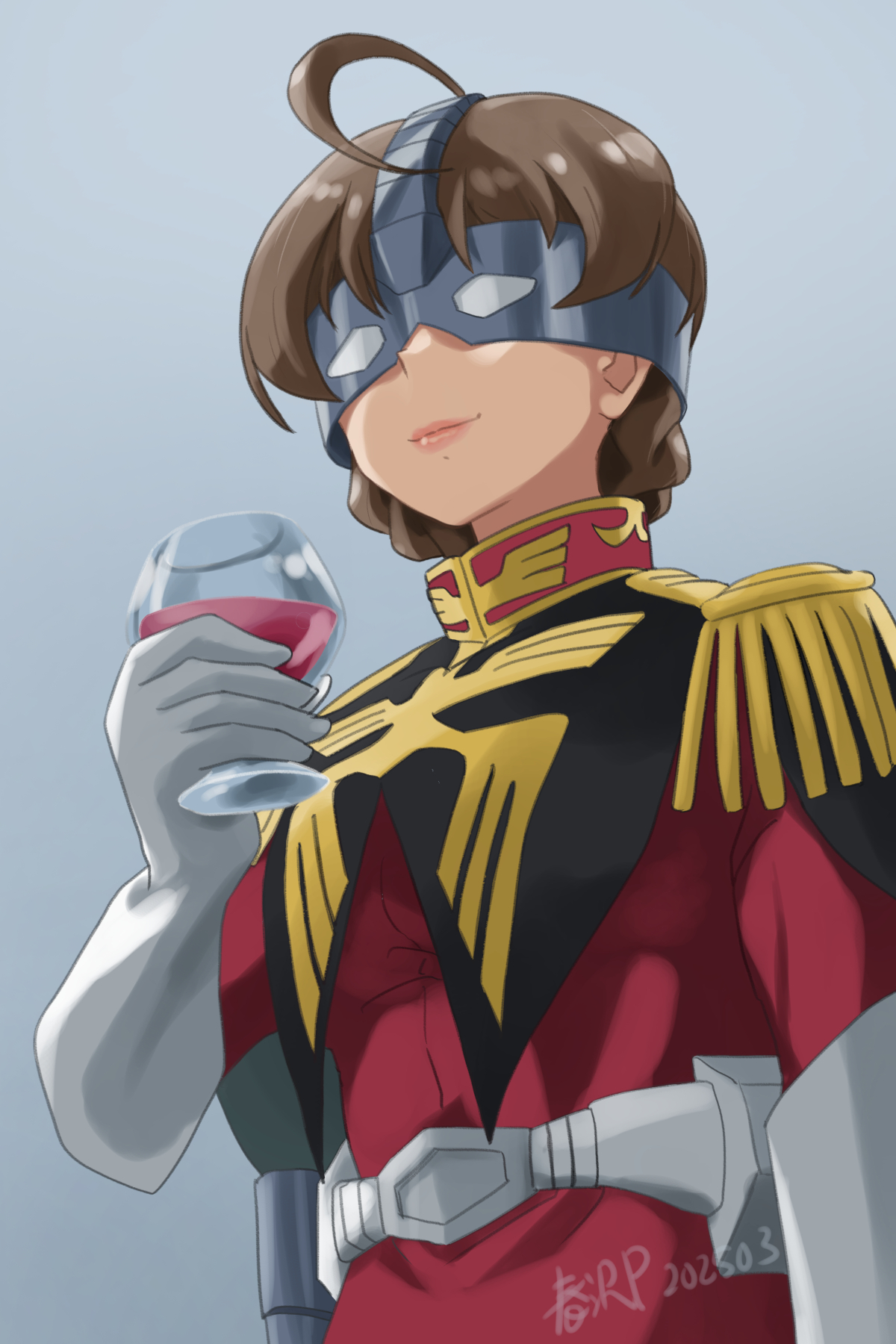 1girlahogeantenna hairbrown hairchar aznable (cosplay)cosplaycupdateddrinking glassepaulettesglovesholdingholding cuplipstickmakeupmasksimple backgroundsolowhite gloveswine glass