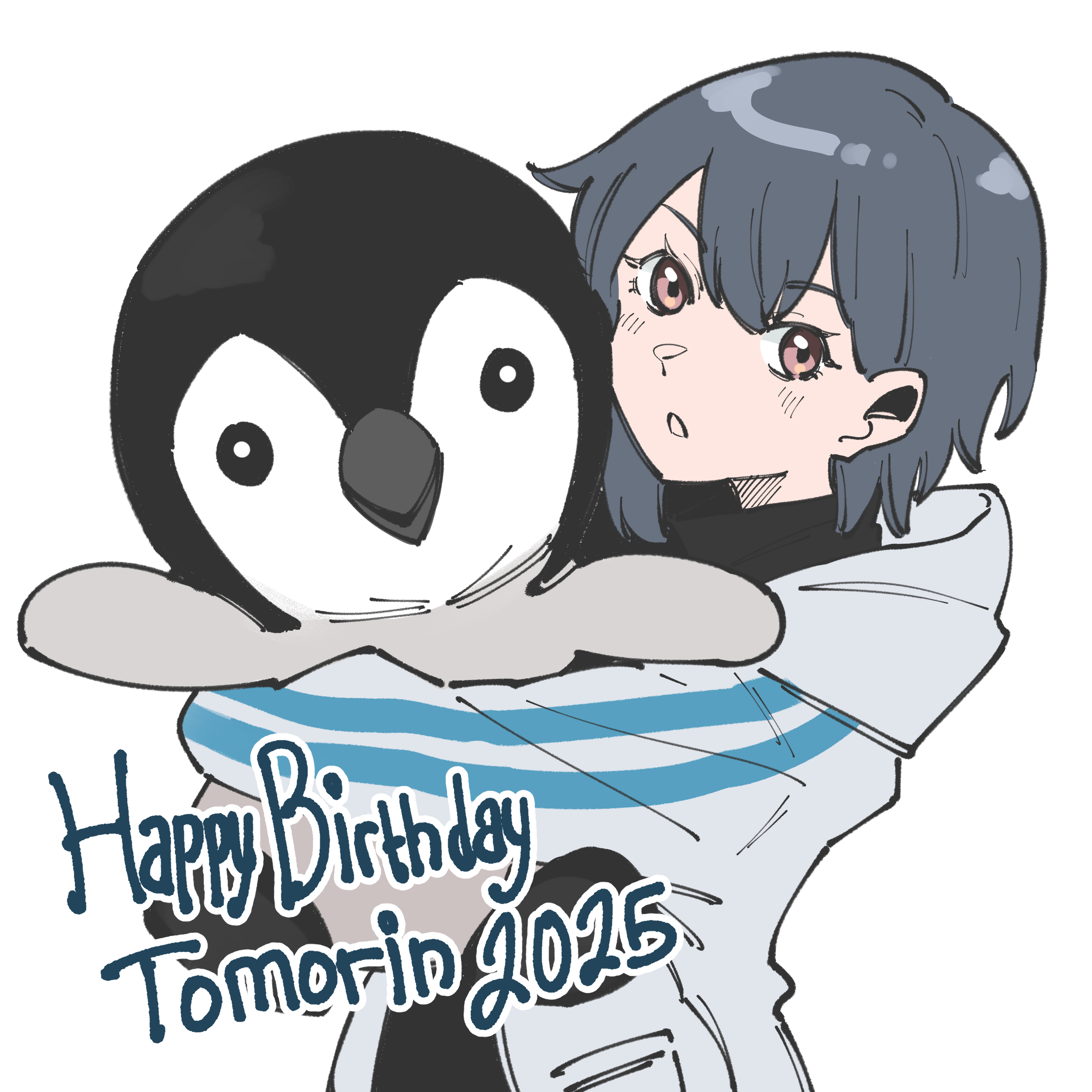 1girlblushbrown eyesgrey hairhappy birthdayhoodhood downhooded jackethugging objectjacketlong sleeveslooking at vieweropen mouthshort hairsimple backgroundsolostuffed animalstuffed penguinstuffed toywhite backgroundwhite jacket