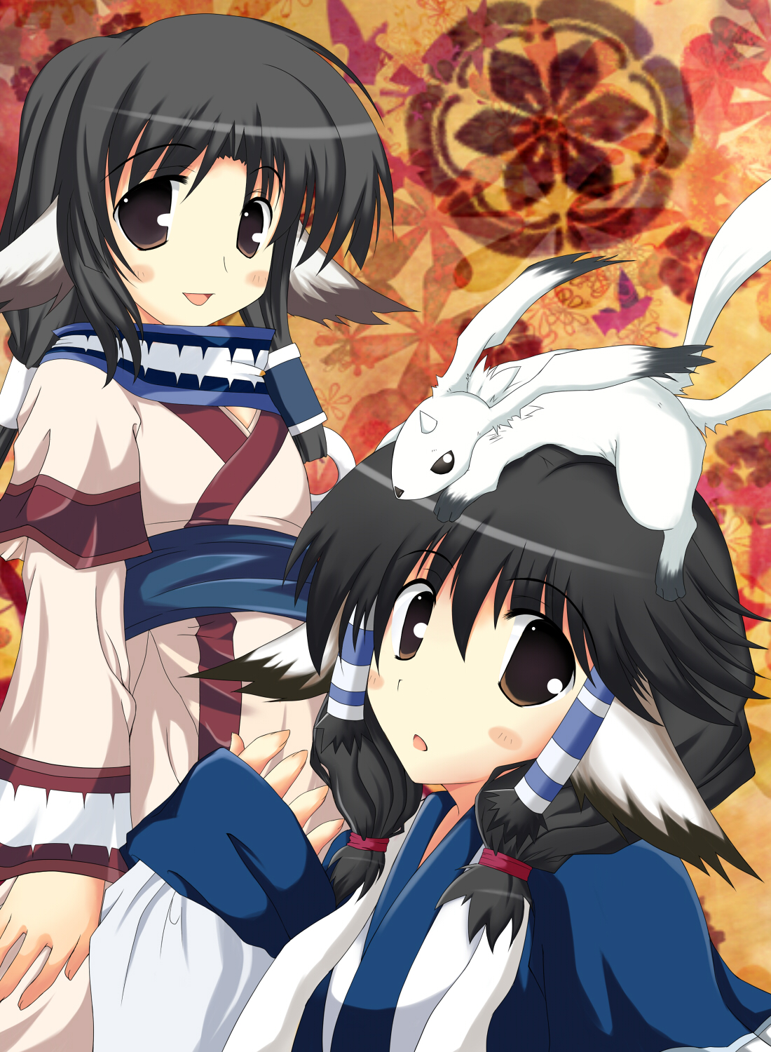 :d:o00s2girlsanimalanimal earsanimal on headblack eyesblack hairblush stickersbreastsbrown eyescreaturedog earsflipped hairfrom sidehair between eyeshair ornamenthair over shoulderhair tiehair tubeshappyhornsjapanese clothesjewelrykimonolayered sleeveslong hairlong sleeveslooking at viewerlow ponytaillow twintailsmultiple girlsmultiple tailson headopen mouthorange backgroundponytailringsashsiblingssidelockssingle hornsisterssmall breastssmilesurprisedtailtwintails
