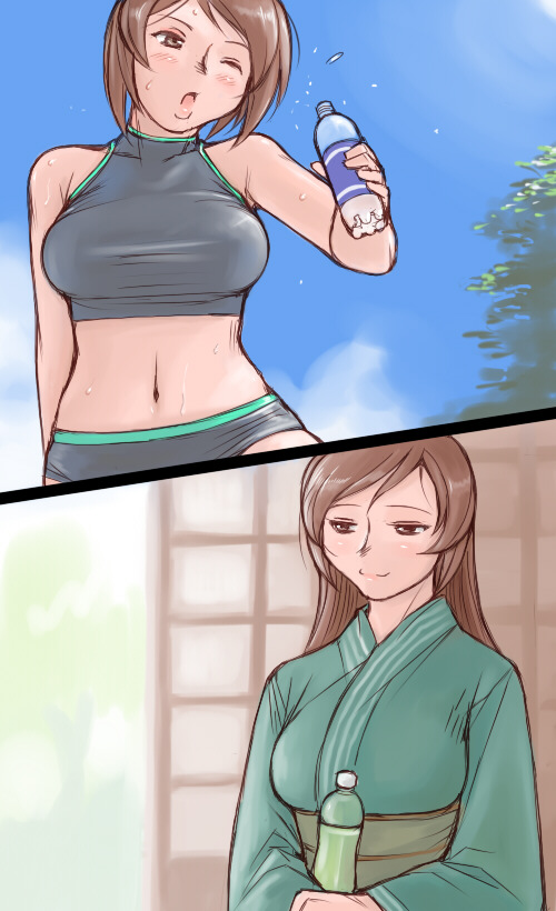 00s2girlsaged upbottlebreastsbrown eyesbrown hairlarge breastsmidriffmultiple girlsone eye closedshort hairsiblingssisterssportswearsweattwinswater bottlewink