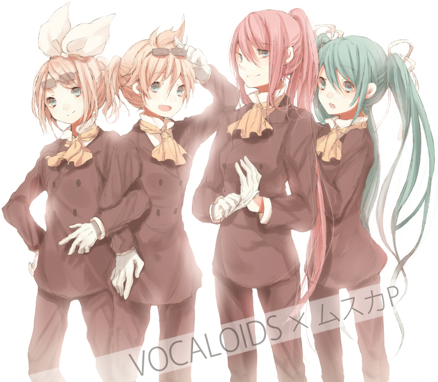 1boy3girlsaqua eyesaqua hairblonde haircosplayformal clothesglassesgloveshair ornamenthair ribbonhaircliplong hairmultiple girlsmuska (cosplay)pant suitpantspink hairponytailribbonshort hairsiblingssmilesuittwinstwintailswhite gloves