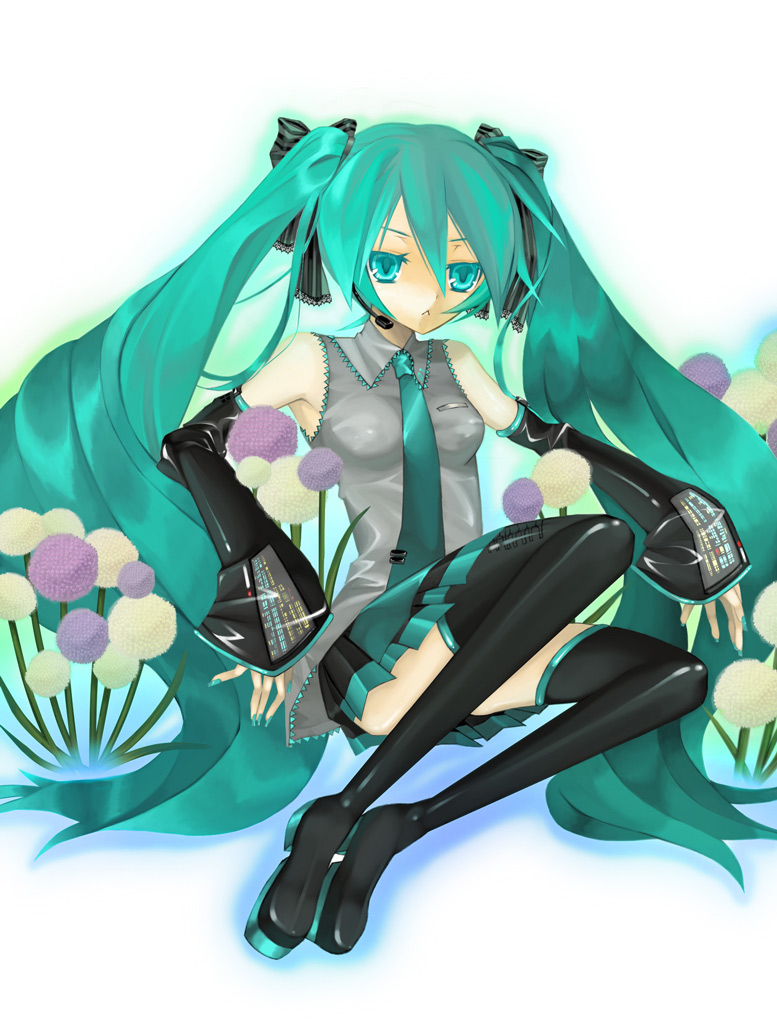 1boy1girlaqua eyesaqua hairdetached sleevesfemale focusflowerhair ribbonheadphonesheadsetlong hairnecktieribbonskirtsolothighhighstwintailsvery long hairzettai ryouiki