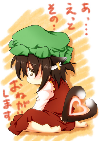 1girlanimal earsbarefootbrown eyesbrown haircat earscat girlcat tailchibidressearringsfemale focusfull bodyhatheartheart tailjewelrymultiple tailsshort hairsolotail