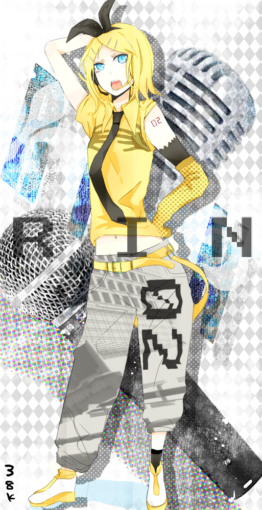 alternate costumeblonde hairblue eyeshair ornamenthair ribbonhairclipmidriffribbonshort hairsolo