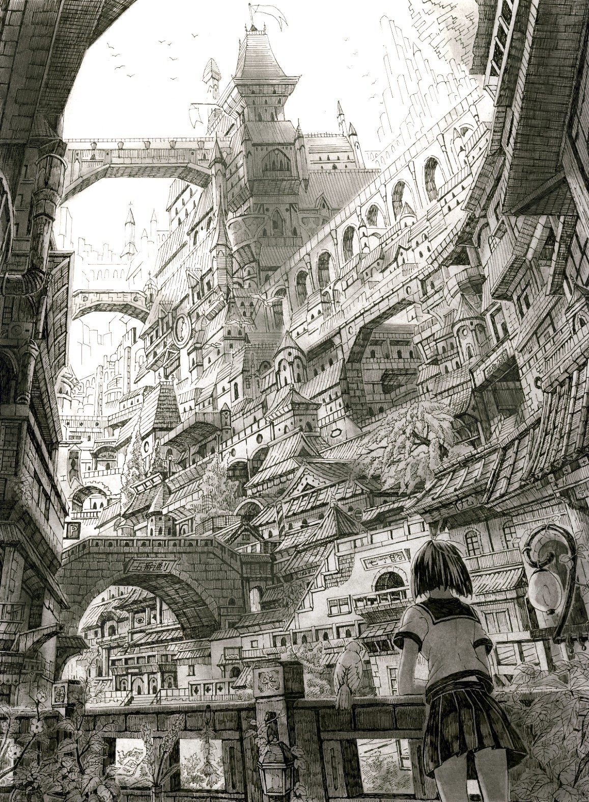 1girlabsurdly detailed compositionbirdcityscapecomplex exteriorgrand scalegreyscalemonochromesceneryschool uniformserafuku