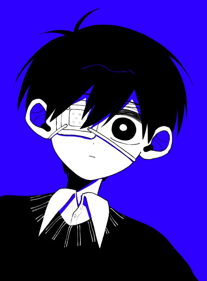 1boyantenna hairblack eyesblack hairblack sweater vestblue backgroundbright pupilsclosed mouthcollared shirtdouble-parted bangseyepatchhair between eyeslimited palettelooking at viewermale focusshirtshort hairsolosweater vestupper bodywhite pupilswhite shirt
