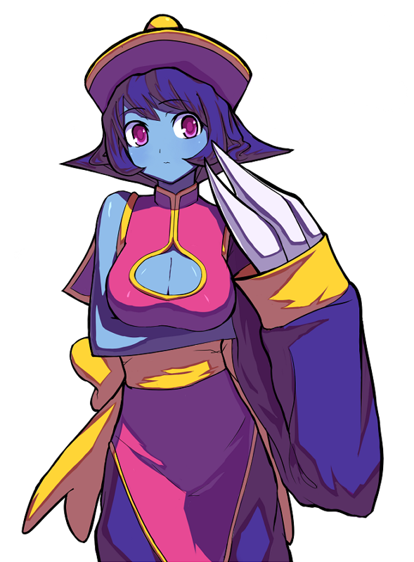 1girlblue hairblue skinbreastschinese clothesclawscleavage cutoutclothing cutoutcolored skinfemale focusflipped hairfondolerhatjiangshilarge breastspurple eyespurple hairqingdai guanmaoshort hairsimple backgroundsolo